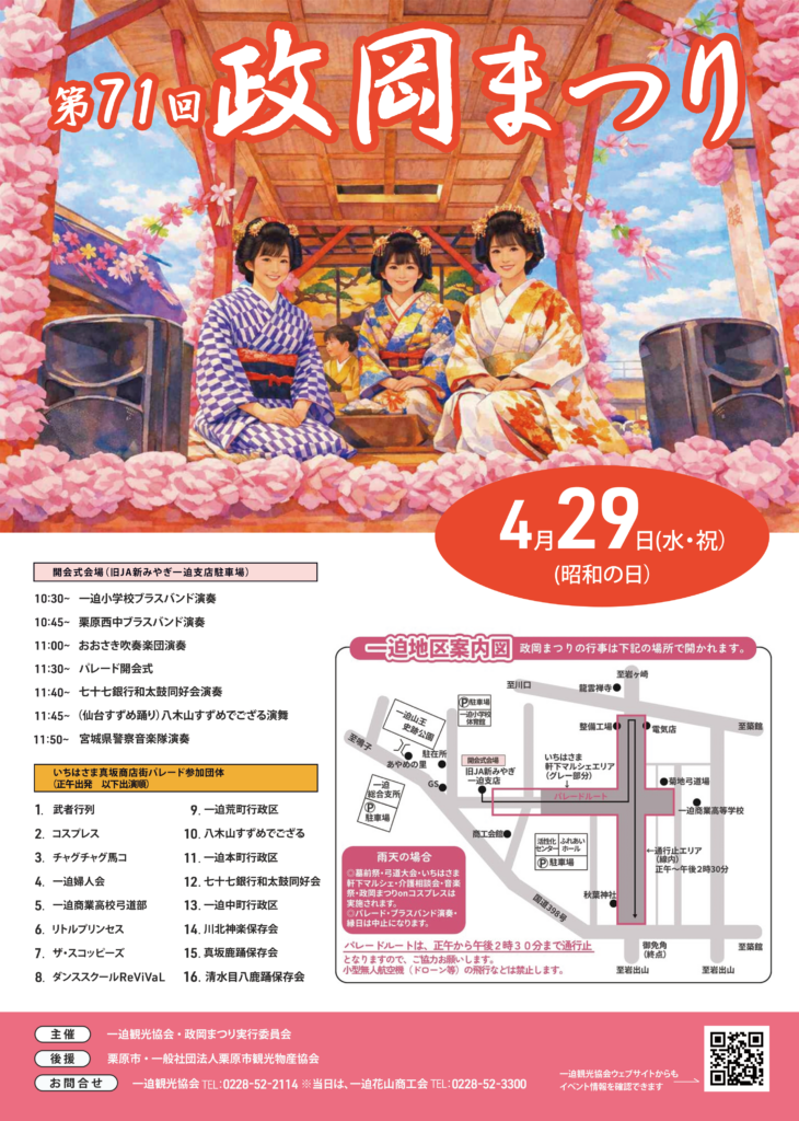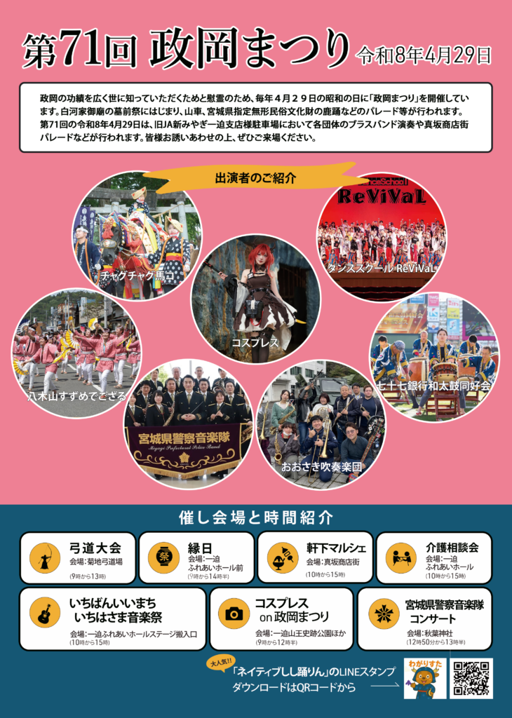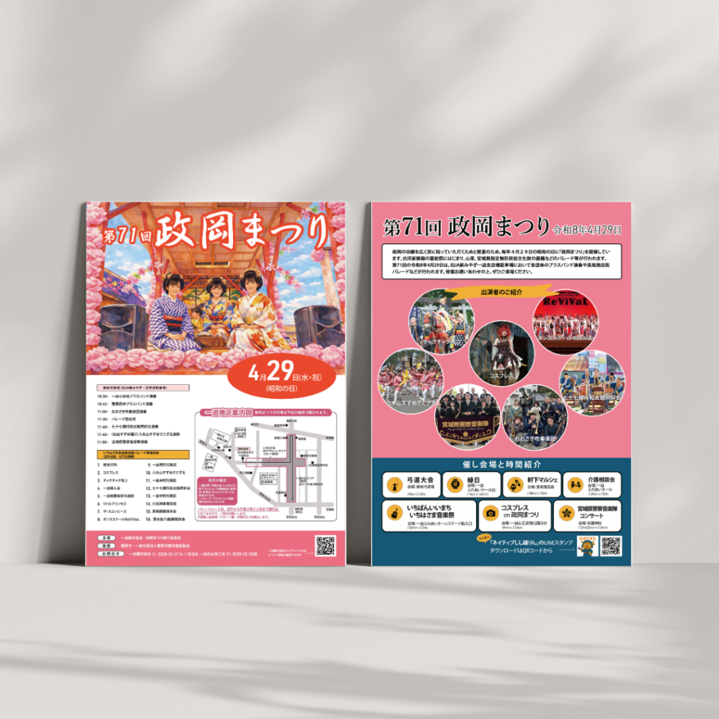 2026年4月29日(昭和の日)に、宮城県栗原市で行われる「第71回 政岡まつり」のチラシ制作をいたしました。